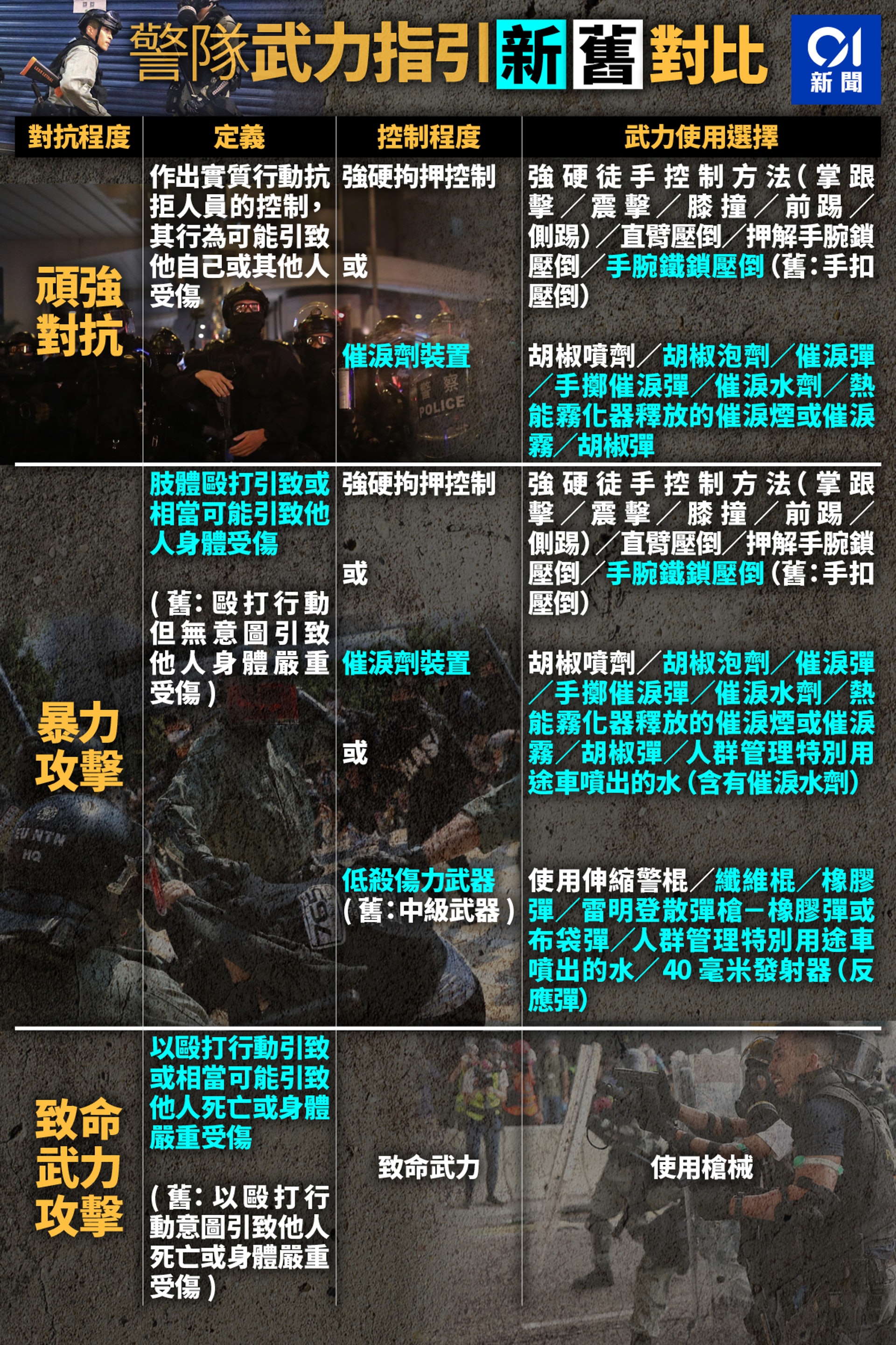 至於控制程度,原本為可以採取強硬拘押控制,或中級武器、即警棍,修改後版本則為除了強硬拘押控制,亦允許使用催淚劑裝置或低殺傷力武器,包括伸縮警棍、警棍、橡膠彈、布袋彈、雷明登散彈槍及水炮車。